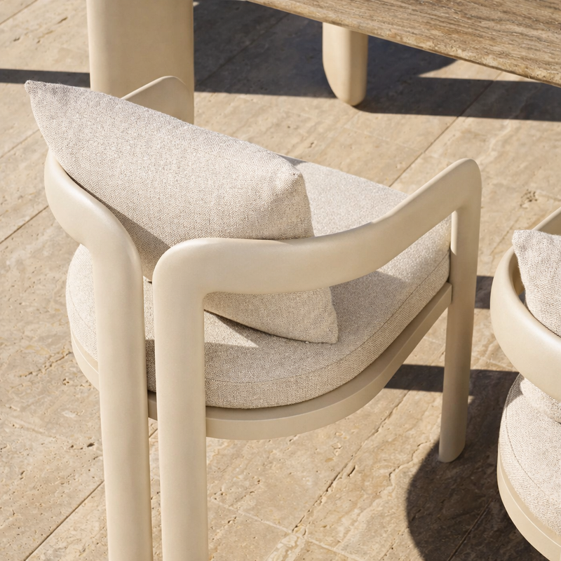 Prized by the ancient Romans for its durability and timeless beauty, Travertine has been used in outdoor and architectural applications for centuries. This sedimentary limestone — characterized by organic pitting and unique patterns — is globally sourced and hand-selected for its tonal harmony with our teak and aluminum collections. Although Travertine is inherently strong, we enhance its resilience by sealing it during production, offering an additional layer of protection from the elements.