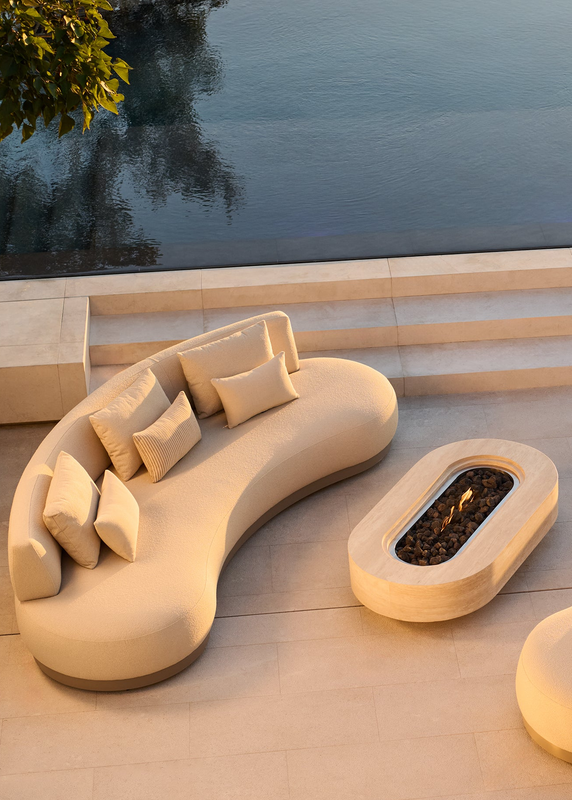 Clean lines and subtle curved details define a luxury contemporary collection that’s stocked in outdoor Italian bouclé — the first of its kind in the marketplace.