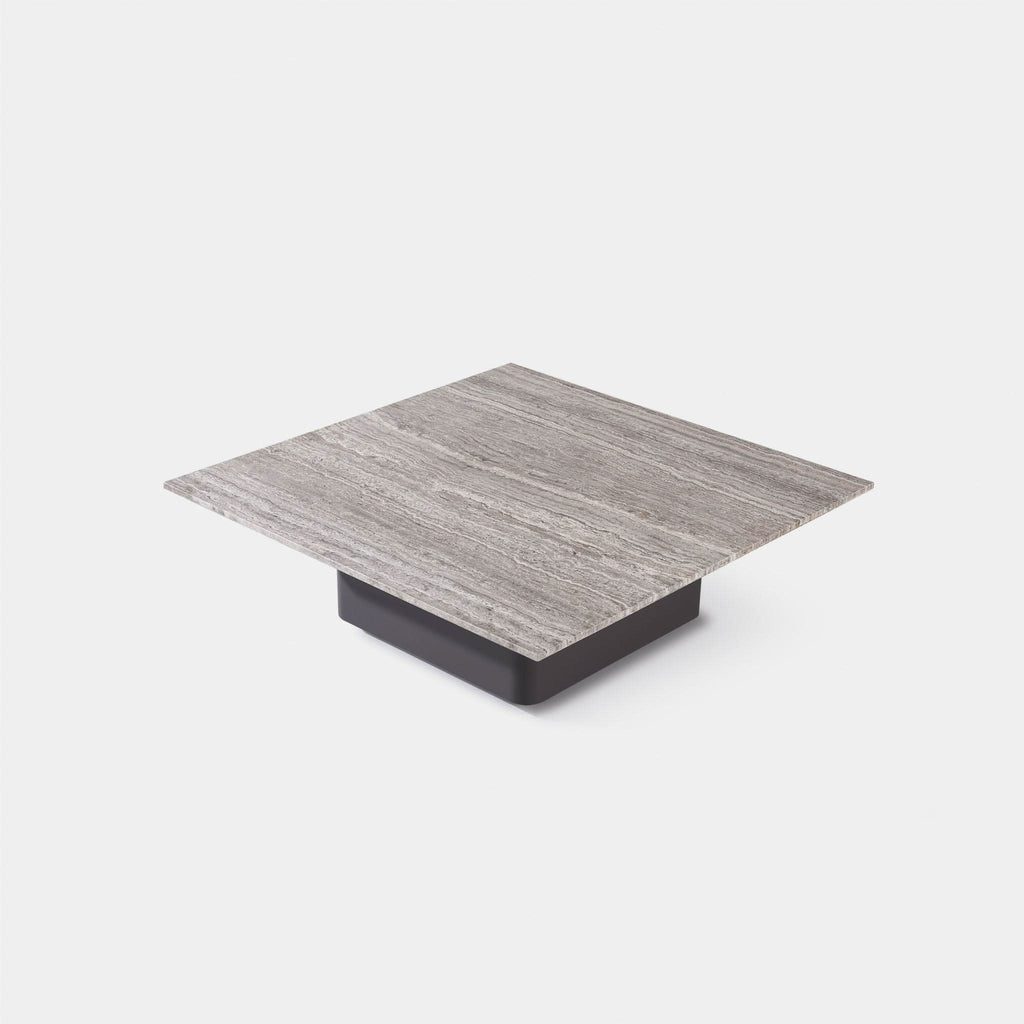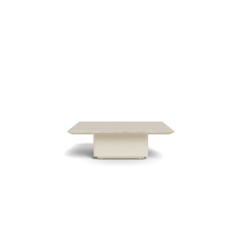 Natural travertine stone tops are set into a matching aluminum base on the Santorini coffee and side tables. A strong, organic contrasting material that intersects and interrupts strong aluminum elements. Travertine is a sedimentary limestone with a fibrous,