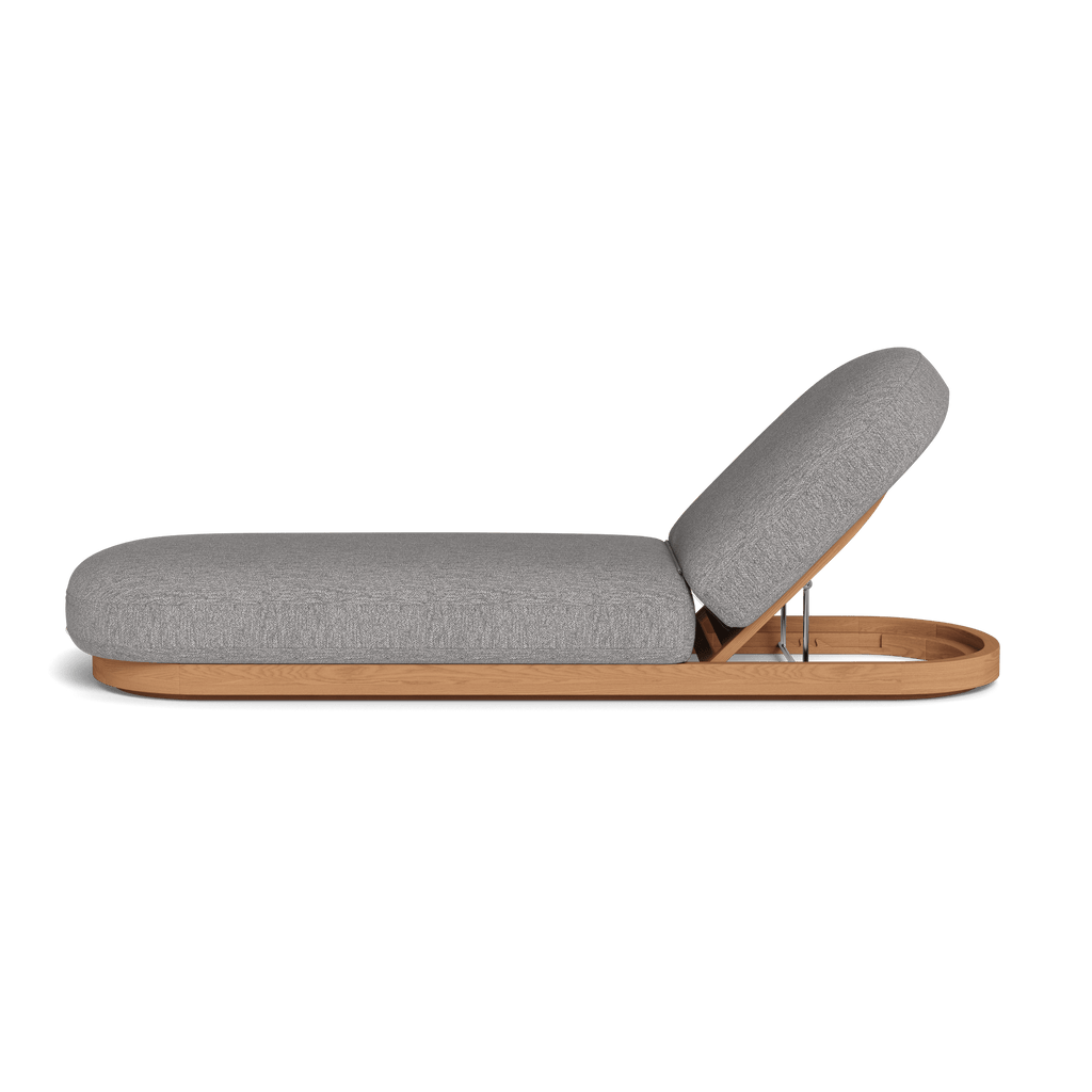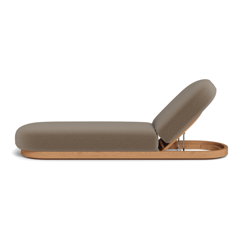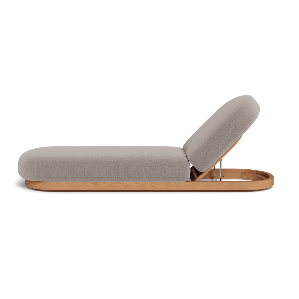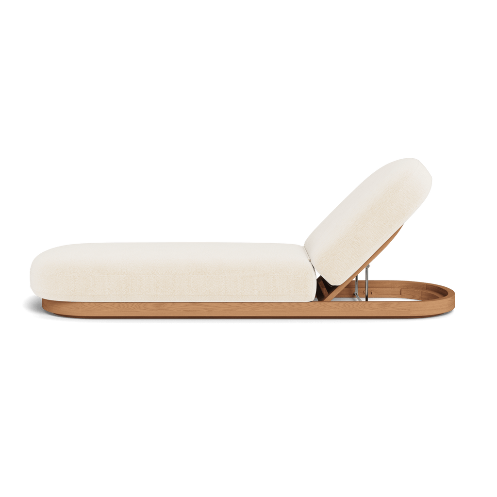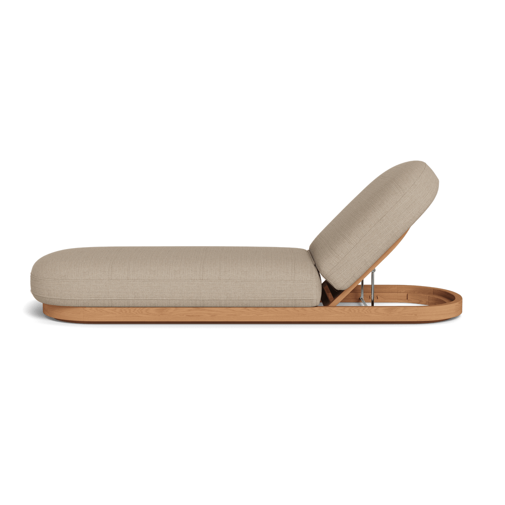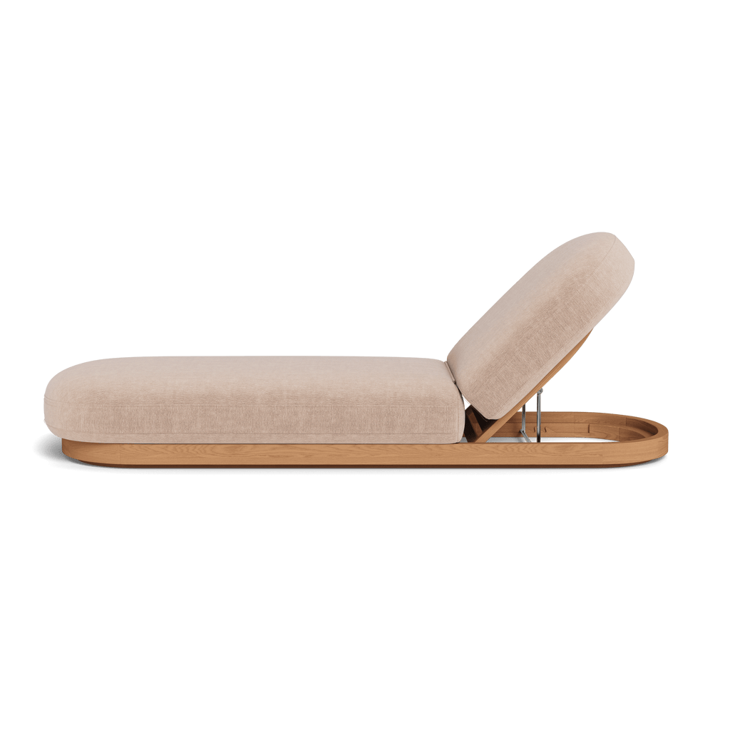 Como Sun Lounge — Luxury Outdoor Chaise Lounge with Adjustable Backrest. The Como Sun Lounge features a subtly pill–shaped design that combines the high–end style and comfort of indoor furniture with the durability of outdoor seating. Expertly upholstered in performance textiles, this chaise lounge sits on a solid teak base in Natural, offering both style and strength. With quick–dry foam for added comfort, it’s engineered for a supported sink–in feel that makes lounging effortless. This luxury outdoor chaise lounge is an elevated take on outdoor relaxation, perfect for your poolside, patio, or garden retreat. The adjustable backrest allows you to discover the perfect lounging incline, ensuring ultimate comfort wherever you choose to unwind.