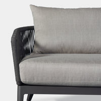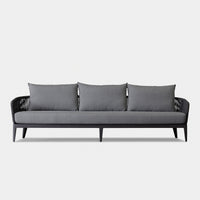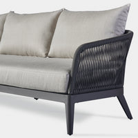 Our Hamilton collection pairs clean lines with practical design. The Hamilton 3 Seat Sofa is contemporary comfort — featuring an extruded aluminum frame in Asteroid or Taupe with tapered legs, sculptural back rest contours and double–layered woven Olefin rope accents in Dark or Light Grey. Enjoy a plush all–weather bench cushion with knife–edge back cushions available in a range of neutral tones for total comfort. This effortless contemporary sofa is made to be incredibly versatile, elevating any outdoor space.