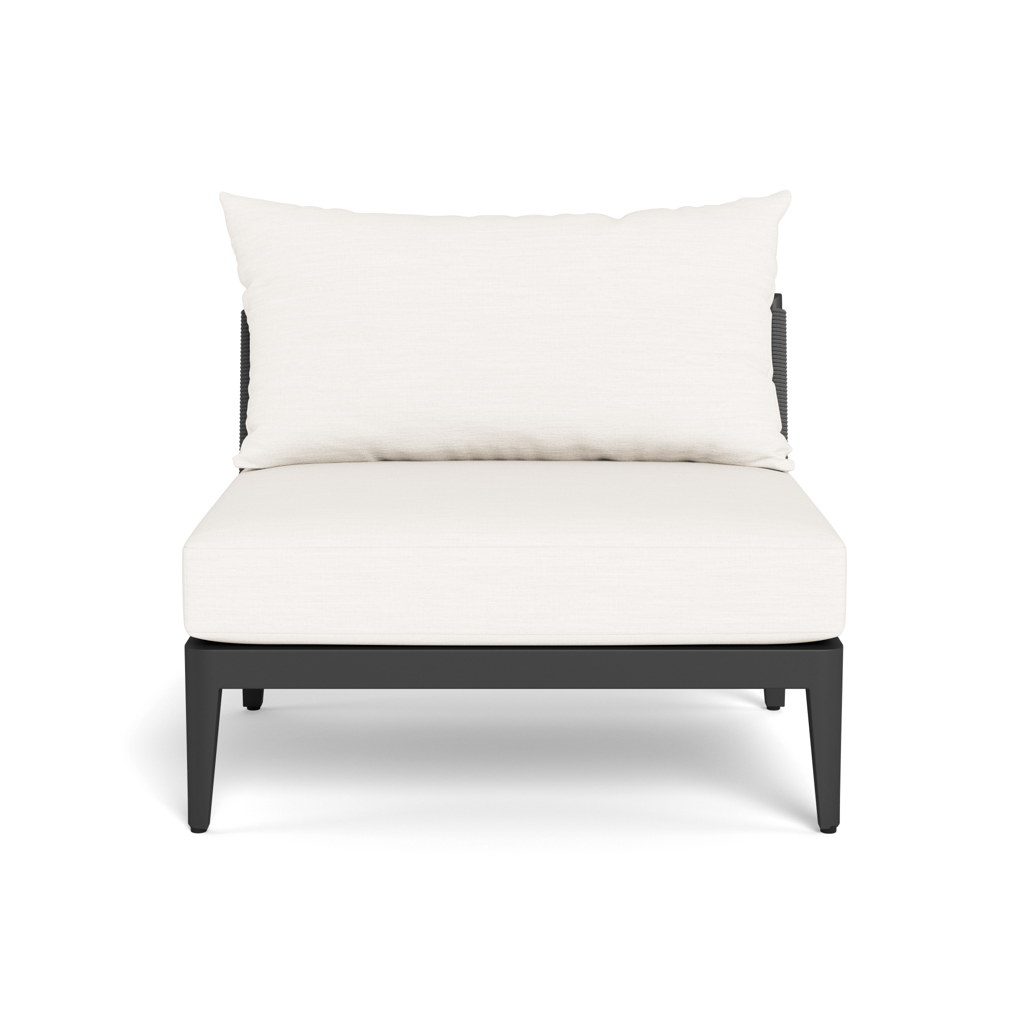 Our Hamilton collection pairs clean lines with practical design. Part of our sectional collection, the Hamilton Armless Single is contemporary comfort — featuring an extruded aluminum frame in Asteroid or Taupe with tapered legs, sculptural back rest contours and double–layered woven Olefin rope accents in Dark or Light Grey. Enjoy a plush all–weather seat cushion with a knife–edge back cushion available in a range of neutral tones for total comfort. This effortless contemporary armless single is made to be incredibly versatile, elevating any outdoor space. Use it as a stand–alone element, or in multiples paired with Corners to create a modular sectional sofa.