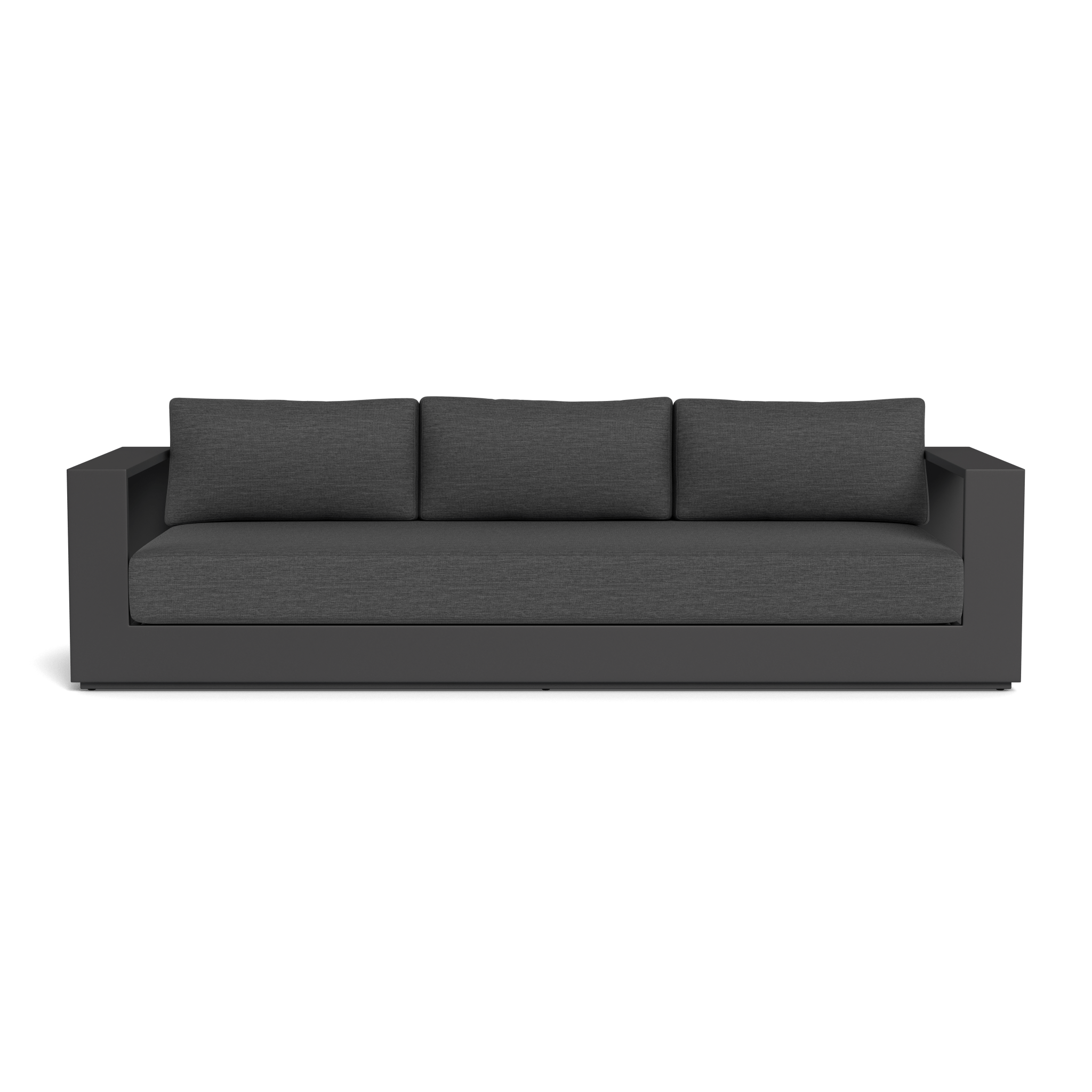 Our Hayman collection is a statement in simplicity with clean angles and modern styling. Defined by its wide arms, our low–profile Hayman 3 Seat Sofa was designed to be experienced — sink into ultimate relaxation with a deep bench cushion in a range of neutral tones supported by a Batyline sling suspension in Silver or White for added comfort, all crafted in a powder coated extruded aluminum frame available in Asteroid or White. Indoor comfort meets outdoor performance with this geometric modern sofa made for a variety of spaces.