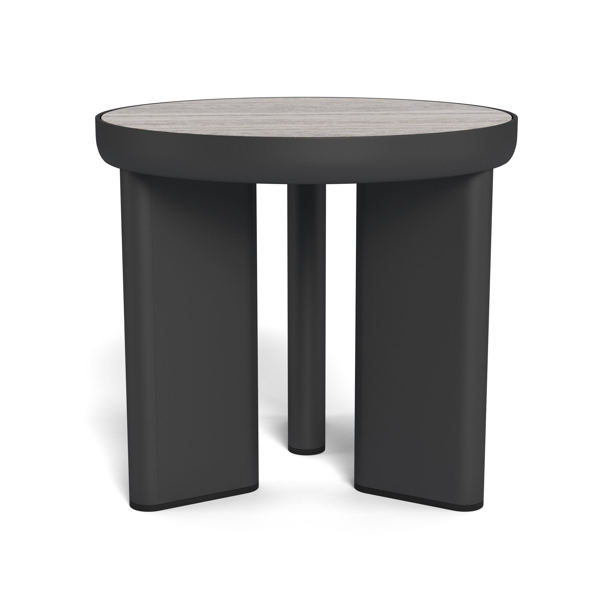 Grey travertine stone tops are set into a matching aluminum border on our Moab tables. A strong, organic contrasting material that intersects and interrupts strong aluminum elements.