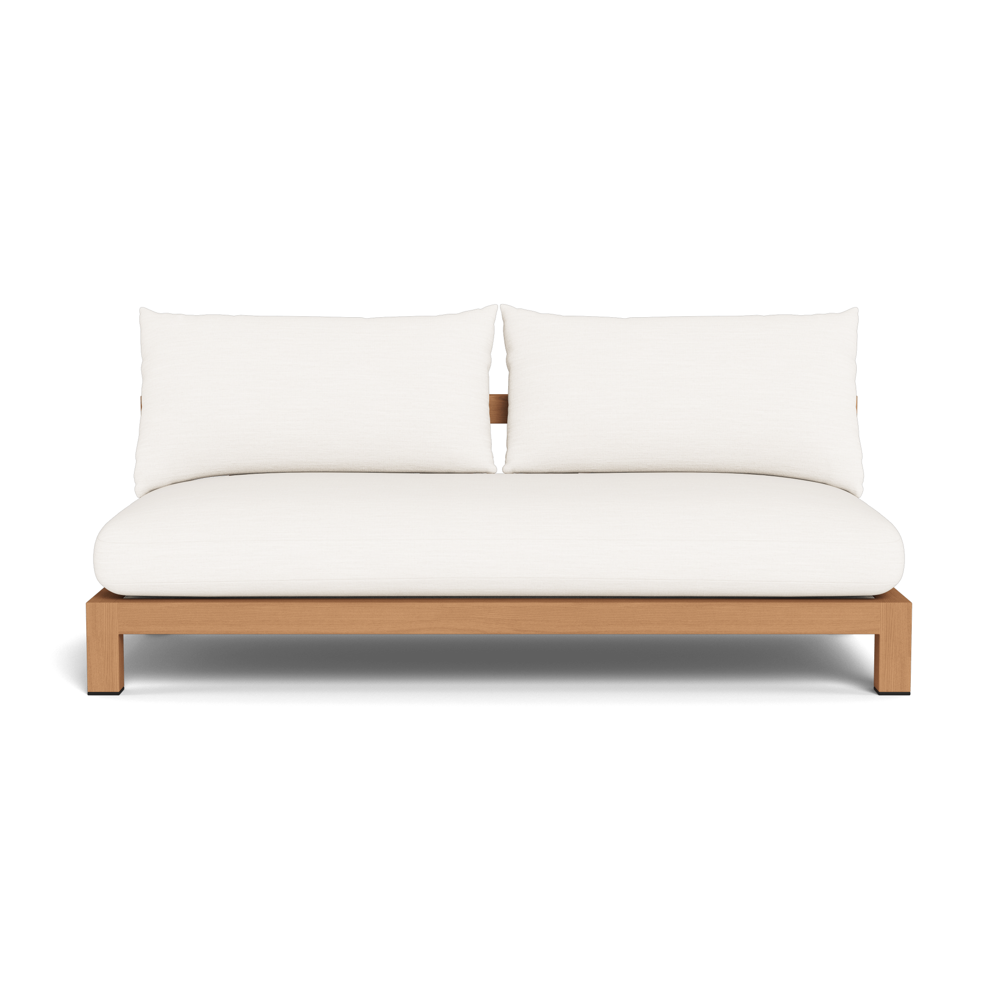 Our Pacific collection features clean lines with a California rustic essence. Part of our sectional collection, the Pacific 2 Seat Armless Sofa is streamlined comfort — relax on a plush domed bench cushion with a pair of knife-edge back cushions available in a range of neutral tones and supported by a Batyline sling suspension in Black or White for added comfort. Handcrafted from square beams of solid Grade A Indonesian teak available in Charcoal or Natural, this modern sofa effortlessly fits in any smaller outdoor space. Use it as a stand-alone element, or pair it with a Corner to extend it as a sectional sofa.