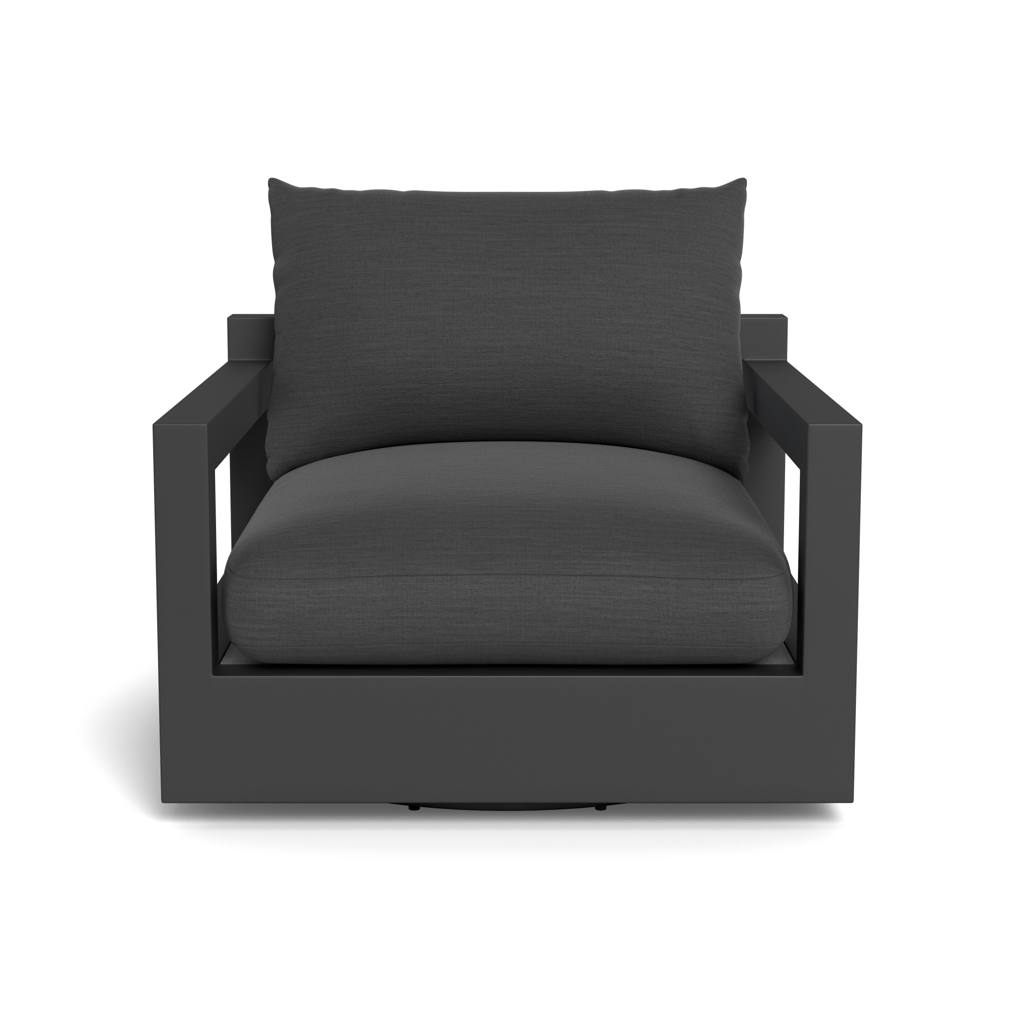 Our Pacific Aluminum collection features clean lines with a California rustic essence. The Pacific Aluminum Swivel Lounge Chair is streamlined comfort — relax on a plush domed seat cushion with a knife-edge back cushion, supported by a Batyline sling suspension for added comfort. Concealed swivel base underneath the plinth base allows for easy rotation. Handcrafted from powder coated extruded aluminum, this piece effortlessly fits in any space — and just may be the perfect lounge chair.
