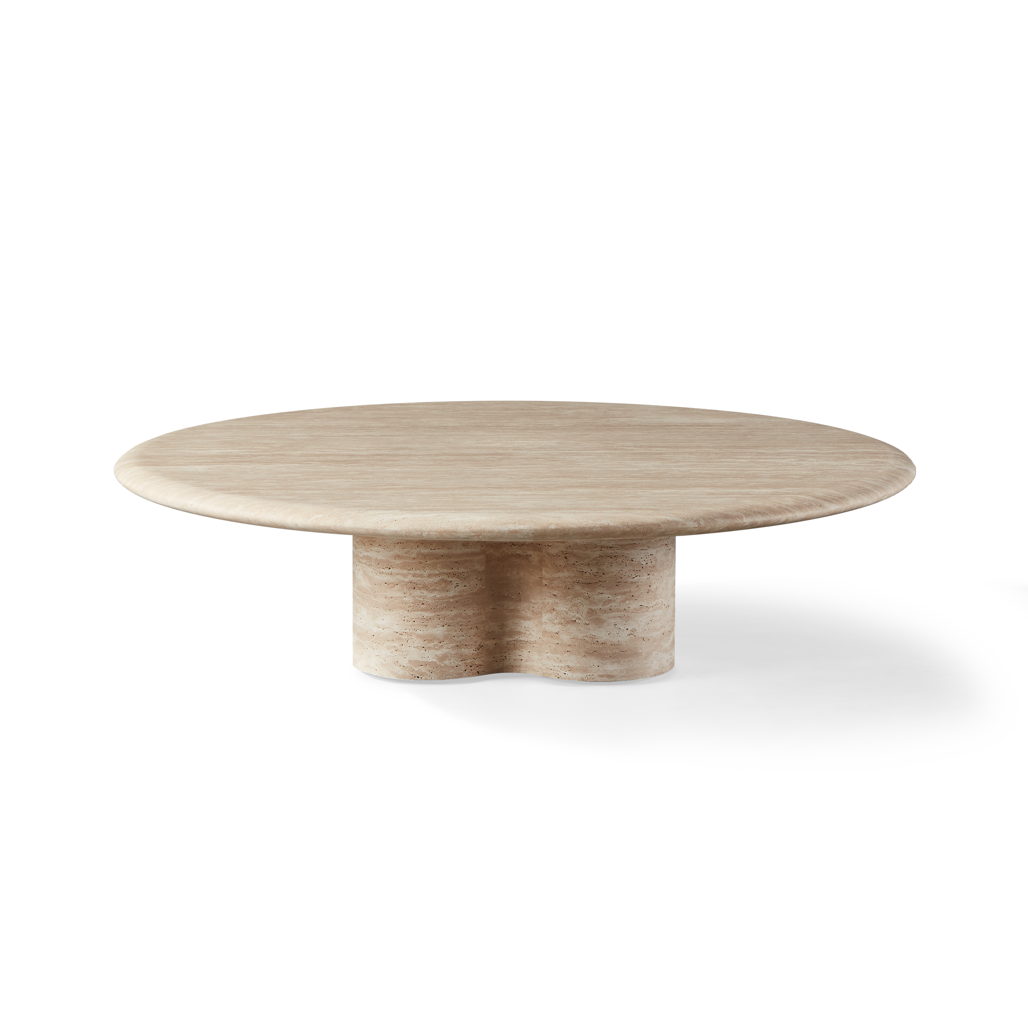 Porto Travertine Round Coffee Table — Sculptural Outdoor Stone Coffee Table with Round Travertine Top and Architectural Base. A celebration of organic form and material authenticity, the Porto Travertine Round Coffee Table features a Natural travertine stone top and a solid sculptural base. Its softly curved silhouette and timeless finish make it the perfect centerpiece for modern patios, garden lounges, or rooftop seating areas.