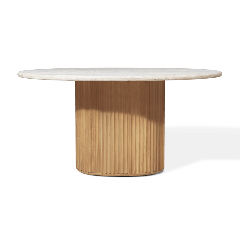 Inspired by the enduring architecture of ancient Rhodes, the Rhodes Teak Round Dining Table 60" brings classical sculptural beauty into modern outdoor living. Its fluted teak pedestal base echoes the vertical rhythm of the historic Lindos columns, creating a striking foundation that balances strength and elegance. The natural travertine top—crafted in a smooth, rounded form without right angles and finished with a refined half-bullnose edge—adds organic sophistication and timeless texture. Perfectly scaled to seat four comfortably, this mixed-material dining table transitions effortlessly from patio to garden to poolside settings, elevating any space with its harmonious, indoor-meets-outdoor design.