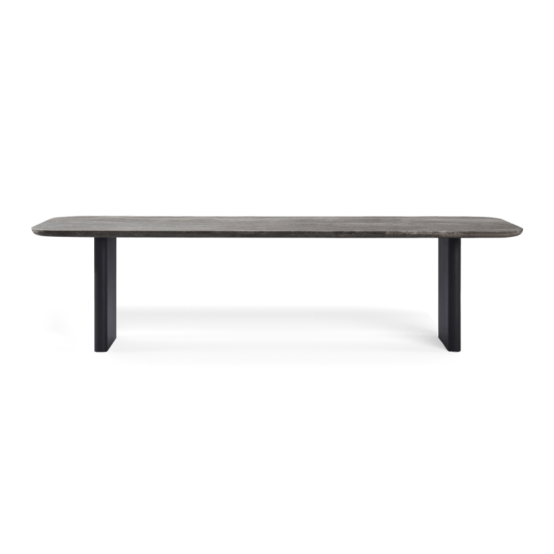 Prized by the ancient Romans for durability and aesthetics, Travertine has been used for outdoor and structural use for centuries. Travertine is a sedimentary limestone deposited by mineral springs with formations located all around the world and is characterized by organic pitting and beautiful and unique patterns . Our Dark Grey Travertine is hand–selected for it’s wonderful swirling balance of grey, brown and charcoal adding a bold but tonally cohesive statement to our tables. While incredible strong and durable, we fill and seal this Travertine in the production process, adding a smooth hand and extra layer of protection from use and the elements.